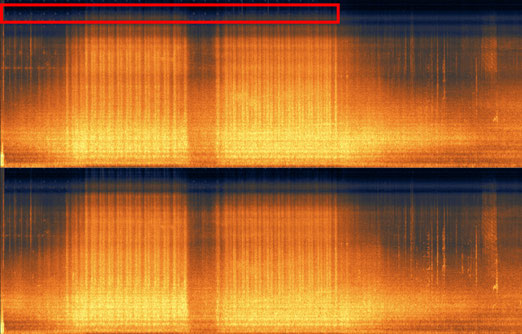 解析結果:高周波成分に周期的な謎の音声を確認。虫の声のようにも聞こえる。電車通過後には音声の発音を確認できず。