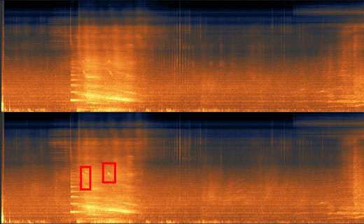 解析結果:電車が通過する瞬間、猫の鳴き声を2回ほど確認。ファイル4で聴いた時よりもはっきりと聴こえる。また、電車の警報機が鳴ってから通過するまで、空間の大きさが変化しているように聴きとれる。