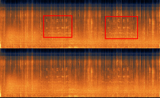 解析結果:音源17秒あたりより2匹の鳥の鳴き声が入っているが、鳴き声が聞こえる時に何かがうねるような音が同時に発生している。